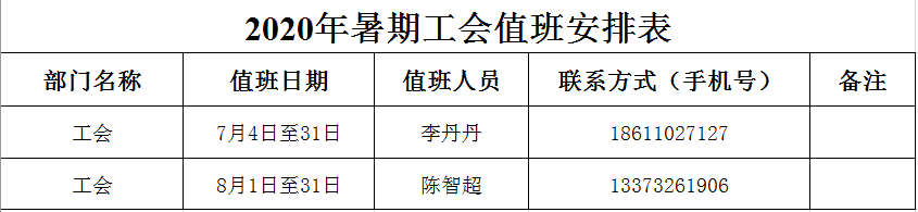 2020年暑期工会值班安排表